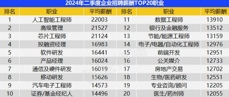智联招聘数据显示,2024年第二季度,38城企业平均招聘月薪为10313元,其中人工智能行业位居薪酬榜首,平均招聘月薪13594元,薪酬同比增长5%。