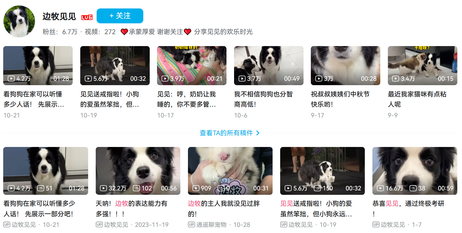 更为普遍的情况是“见宠不见人”,即账号内容主要围绕宠物,博主本人不出镜。如此一来,账号展现的就是宠物而非主人的个性,与观众建立情感连接的也是宠物,博主很难像其他领域的博主那样建立商业上的信任感,把个人魅力转化为观众的购买力。