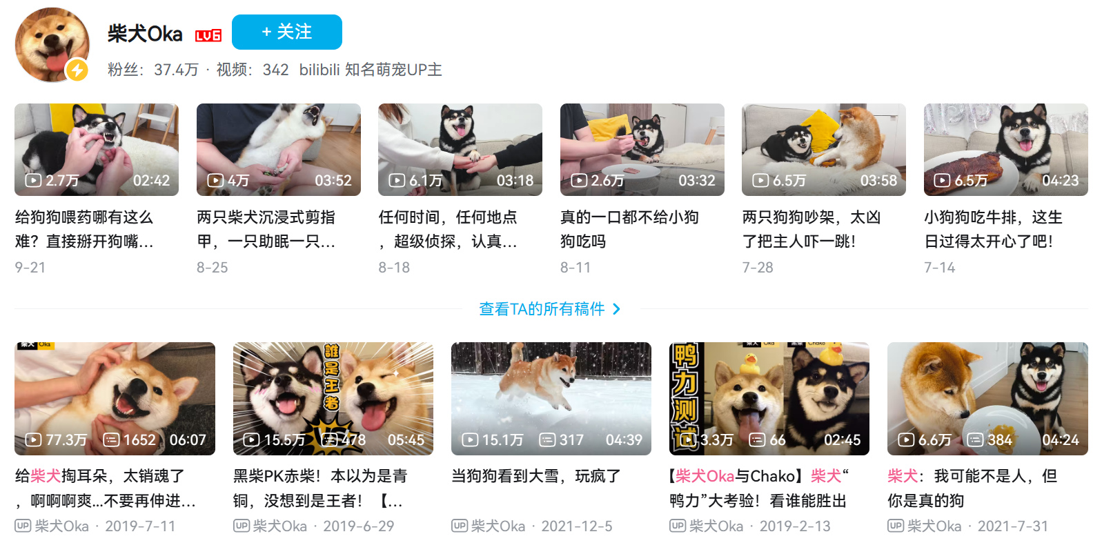博主“柴犬Oka”即是如此。该账号在B站拥有37.4万粉丝,视频内容围绕着两只柴犬Oka和Chako,主人夫妇Oka爸和Oka妈出现在镜头中时从不露脸。