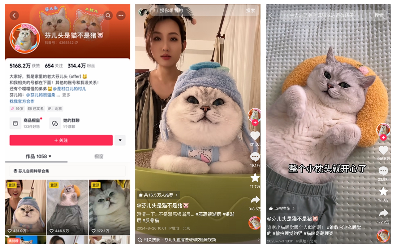 另一位靠宠物在直播带货领域独树一帜的博主是“芬头儿是猫不是猪”。该账号吸睛之处是一只神态格外有趣的银渐层猫咪,名叫“芬头儿”。它有时表情神似人的假笑,主人直播时会乖巧地趴在镜头前,被网友称作“先天直播圣体”。它看似“被迫打工”,因此有人说它有“班味”。