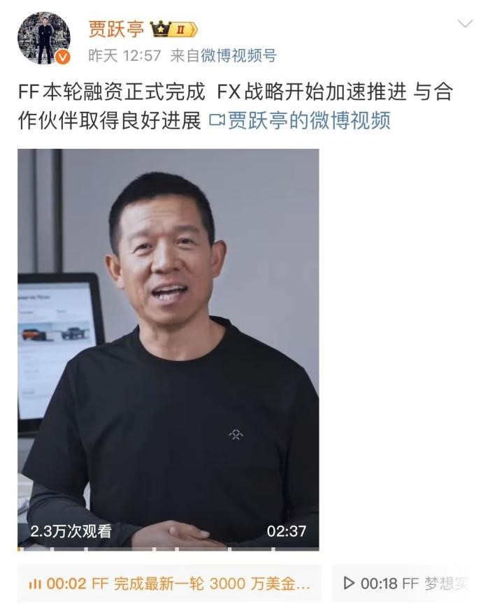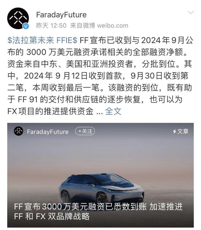 法拉第未来FF微博宣布此前公布的3000万美元融资(约合2.1亿人民币)已经全部到账,投资者来自中东、美国和亚洲。他还表示,这笔融资的到位既有助于FF 91的交付和供应链的逐步恢复,也可以为FX项目的推进提供资金。同一时间,贾跃亭也发来微博对此事表示庆祝。