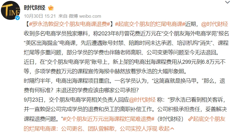最近,“交个朋友”的海外电商课就被曝出“烂尾”“无法退费”等问题。根据“时代财经”报道,交个朋友的海外电商基础课程299元,学员被引流至私域后还有8800元起步的客单价更高的课程。有学员表示,课程开启30天后,大家的美区账号先后出现限流、收款账号封禁、不能挂商品链接等问题;而“陪跑老师”却逐渐离职消失,课程烂尾。同时,由于“交个朋友”对海外课程业务进行调整,学员退费也变得步履维艰。