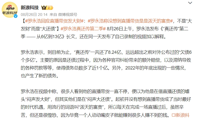 今年8月,罗永浩宣布自己已经结束了第一回合的“真还传”,接下来还有6亿元左右国有资本债款要继续偿还,未来仍会“将通过录制综艺节目、接广告和代言、请文化名流和影视明星来直播间交流和带货等方式,继续还债。”这或许也是罗永浩近期直播频率有所提升的原因之一。