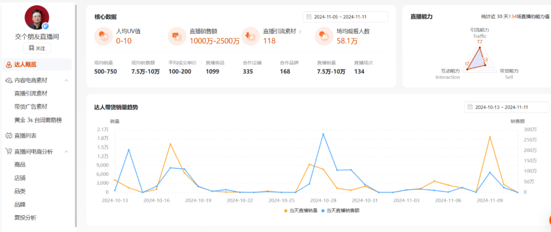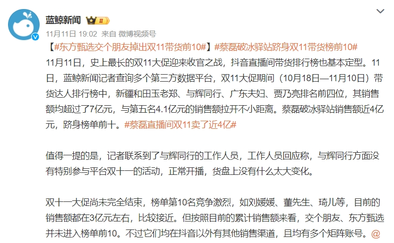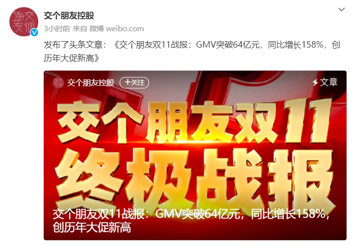 值得一提的是,在近期超头主播频繁“带货翻车”的背景下,今年“双11”淘宝直播整体成交金额、购买用户数均实现大幅度同比增长。“趣解商业”观察到,“交个朋友”是此次为数不多仍在发布战报的头部MCN机构。