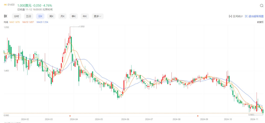 而今年“双11”的喜人战绩似乎也没有为交个朋友控股的股价带来明显的拉升;11月12日,交个朋友控股(1450.HK)当日股价下跌4.76%,报收1港元/股,总市值13.86亿港元。