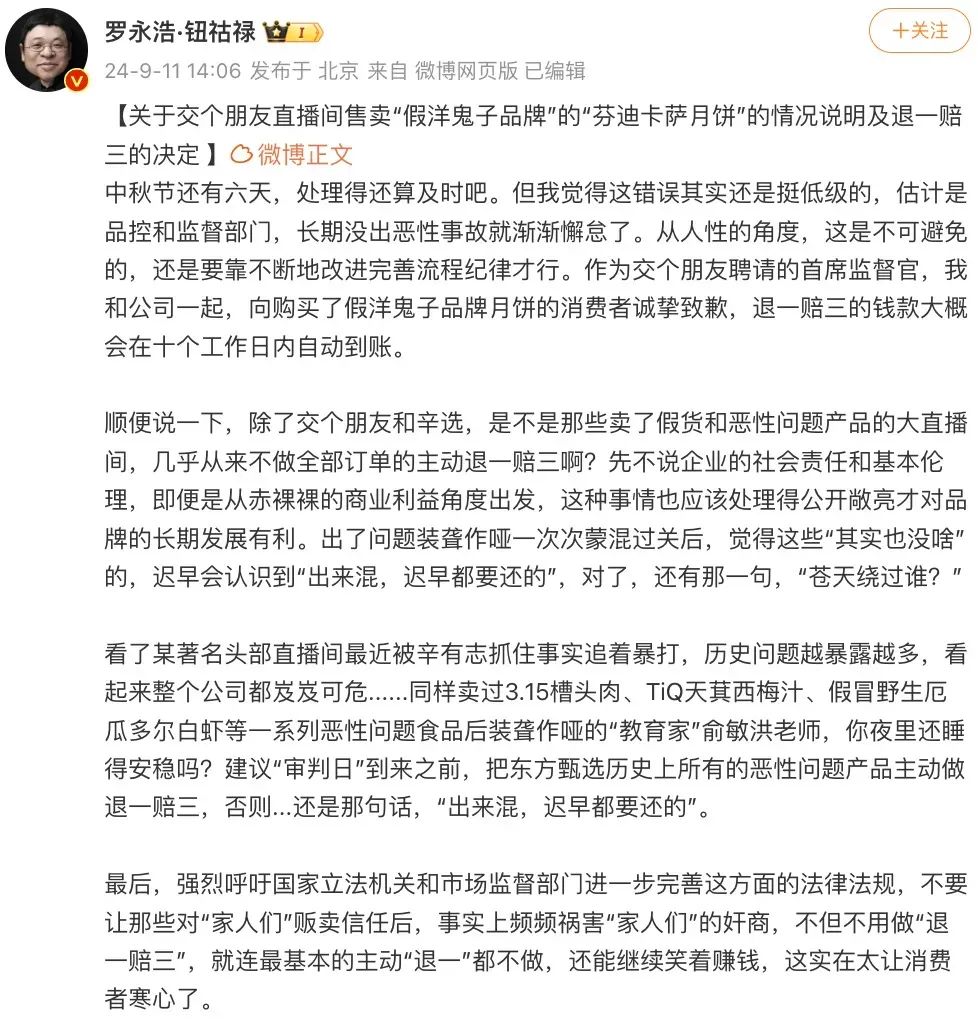 在9月份,罗永浩带货的“FENDI CASA月饼伴手礼”,也被曝出与奢侈品品牌“FENDI”存在品牌关联性、涉嫌造假。事件爆发后,“交个朋友”决定给予购买月饼的用户“退一赔三”的补偿。