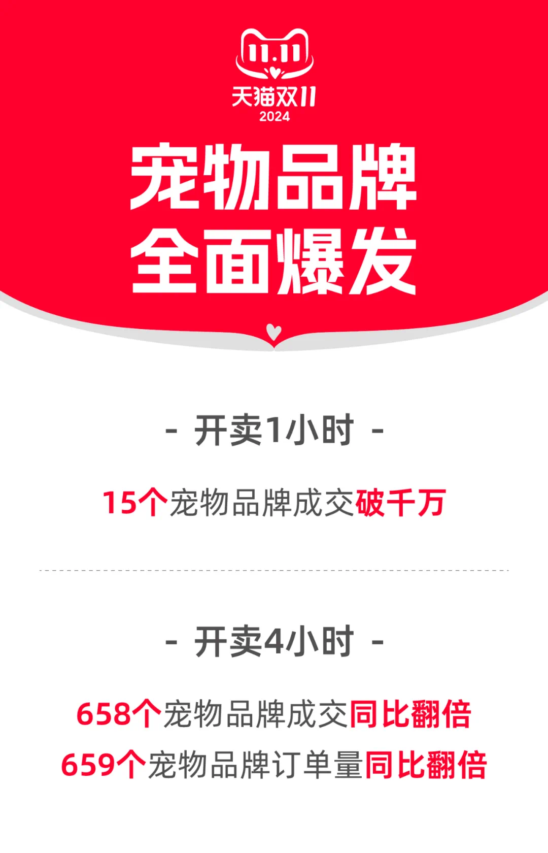 今年10.21,天猫双11开卖当天,仅1小时便有15个宠物品牌成交破千万;开卖4小时,直播成交同比大涨123%,658个品牌成交同比翻倍,659个品牌订单量同比翻倍。