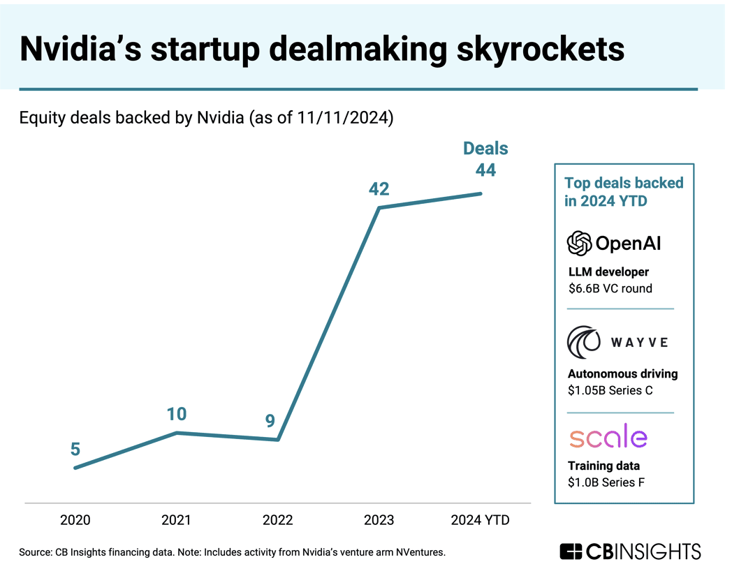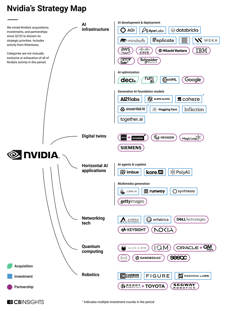今年以来,英伟达先后收购了多家创企。据调研机构CB Insights统计,英伟达今年已经投资至少44家企业,达到历史之最。