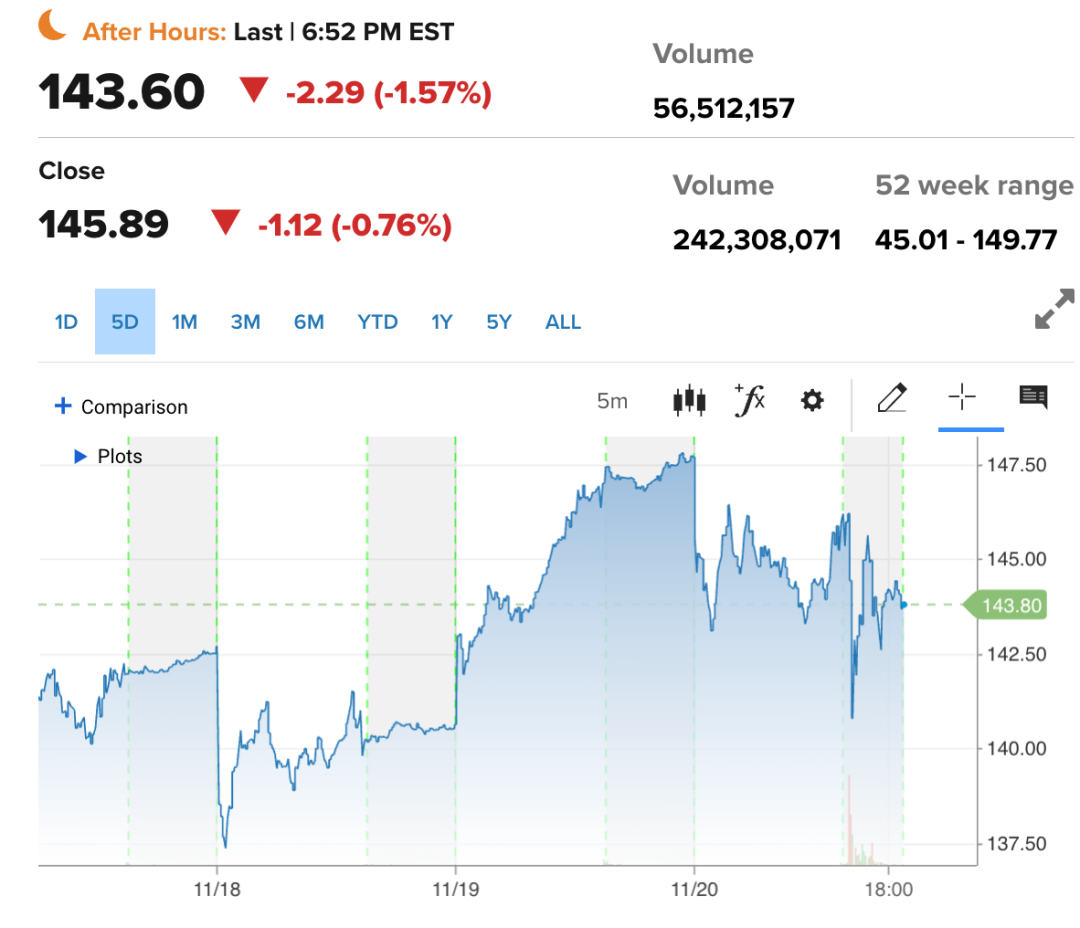 财报公布后,英伟达股价在盘后交易中下跌约2.29%,在常规交易时段,该公司股价收盘下跌 1.12%。投资者们主要担忧英伟达的芯片销售放缓,调整后,英伟达Q3的毛利率降至75.0%,同比下降0.7%。