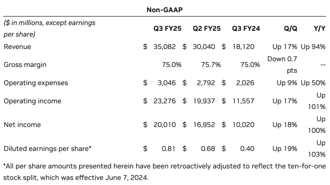 11月21日,英伟达发布截至2024年10月27日的2025财年第三季度财报,财报Q3营收创纪录达351亿美元(折合人民币约为2281亿元),同比增长17%,环比增长94%;调整后净利润为200亿美元(折合人民币约为1449亿元),同比增长为18%,环比增长为100%。