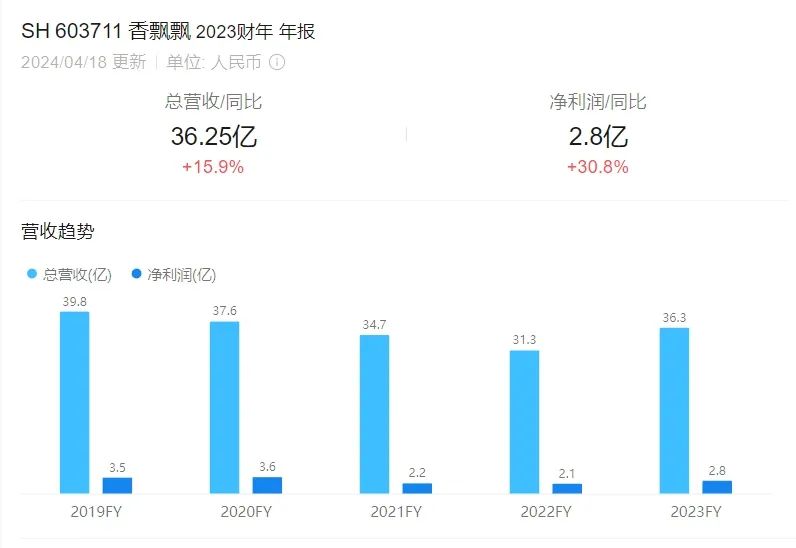 2020年开始,香飘飘营收趋势由上升转向下降,且速度一度接近10%,净利也在2021年开始出现下滑,幅度最大达到37.90%。直到2023年,两项指标才重新回到上升状态,但始终没能回到2019年的巅峰水平。