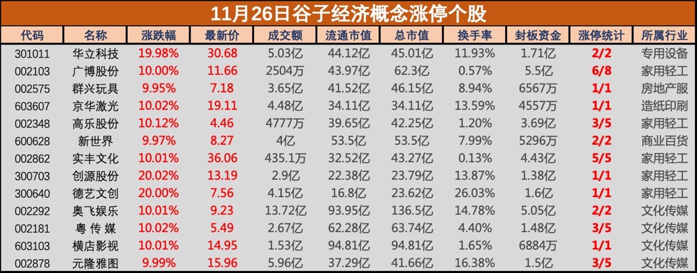 11月26日,谷子经济概念大涨,华立科技(301011)、广博股份(002103)、实丰文化(002862)、奥飞娱乐(002292)、高乐股份(002348)、创源股份(300703)、星辉娱乐(300043)、德艺文创(300640)等多股涨停。