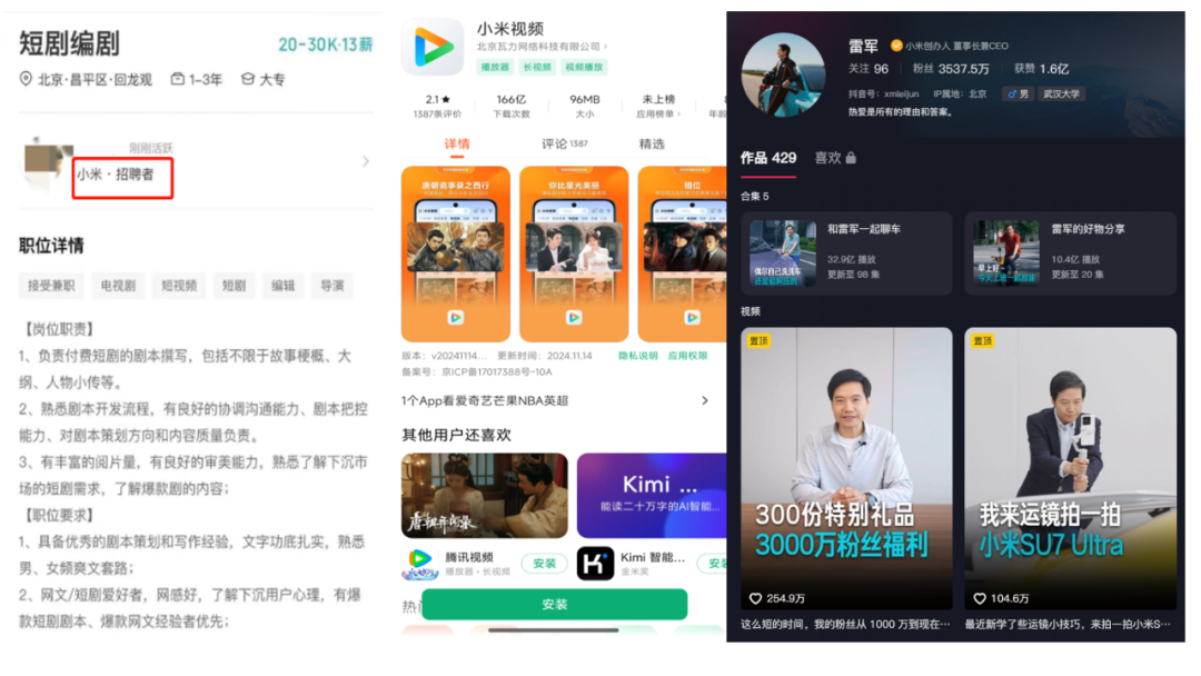 5月初,小米公司发布一则30万招聘短剧编剧的消息,同样引发广大关注。11月15日,DataEye短剧观察在小米应用市场发现,小米短剧APP已经上线。近期,小米总裁雷军更是通过短视频和直播等方式,以“人格魅力”吸引了大批粉丝。