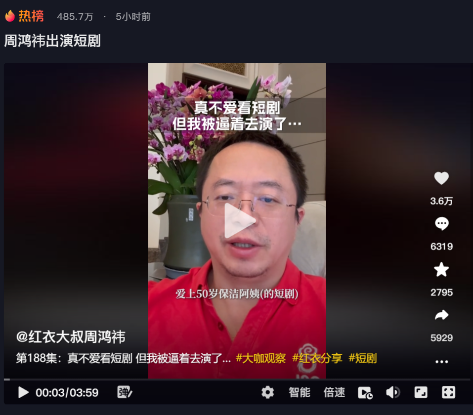 而从抖音热度来看,#周鸿祎出演短剧#的话题词条也登上热榜,热度达485.7W,相关视频的点赞超过3.6W。