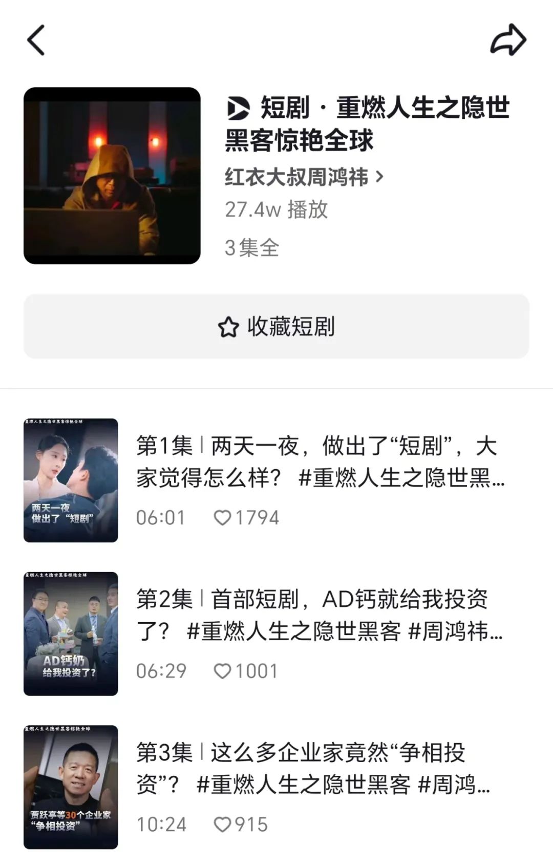 该短剧也在红果短剧APP和“红衣大叔周鸿祎”抖音号同步上线,1小时内播放量达7.3W。截至发稿前,该短剧3小时内,播放量达27.4W播放量。在红果短剧APP内热度达9.5W。