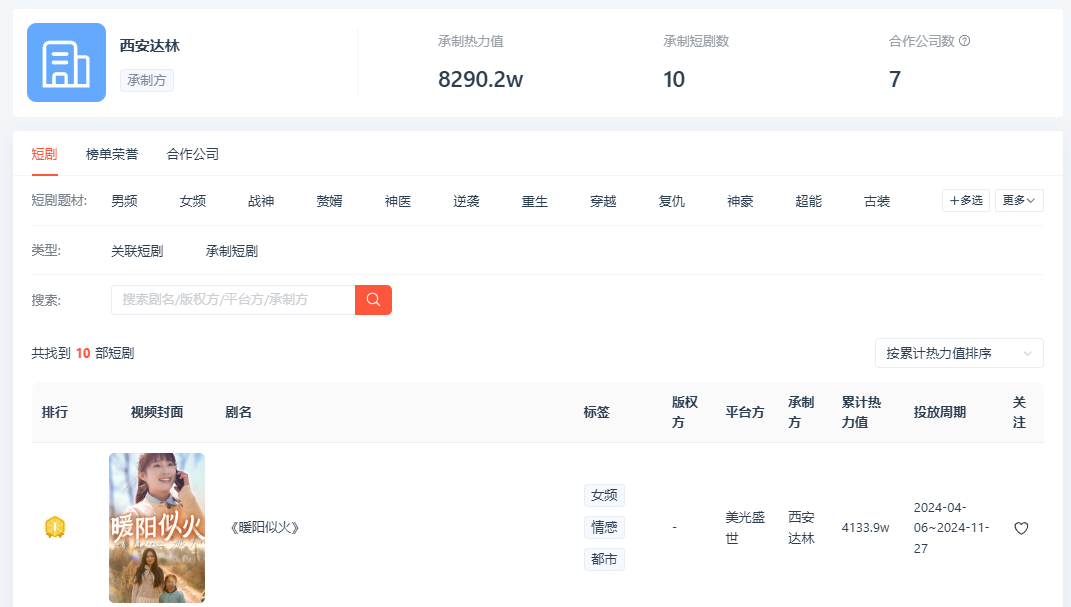 而从海报下方的短片制作团队来看,该短剧由西安达林内容和千墨文化共同完成。西安达林内容是短剧行业较为知名的短剧承制团队。从DataEye-ADXray行业版后台数据来看,西安达林今年承制短剧有10部,承制热力值达8290.2W。
