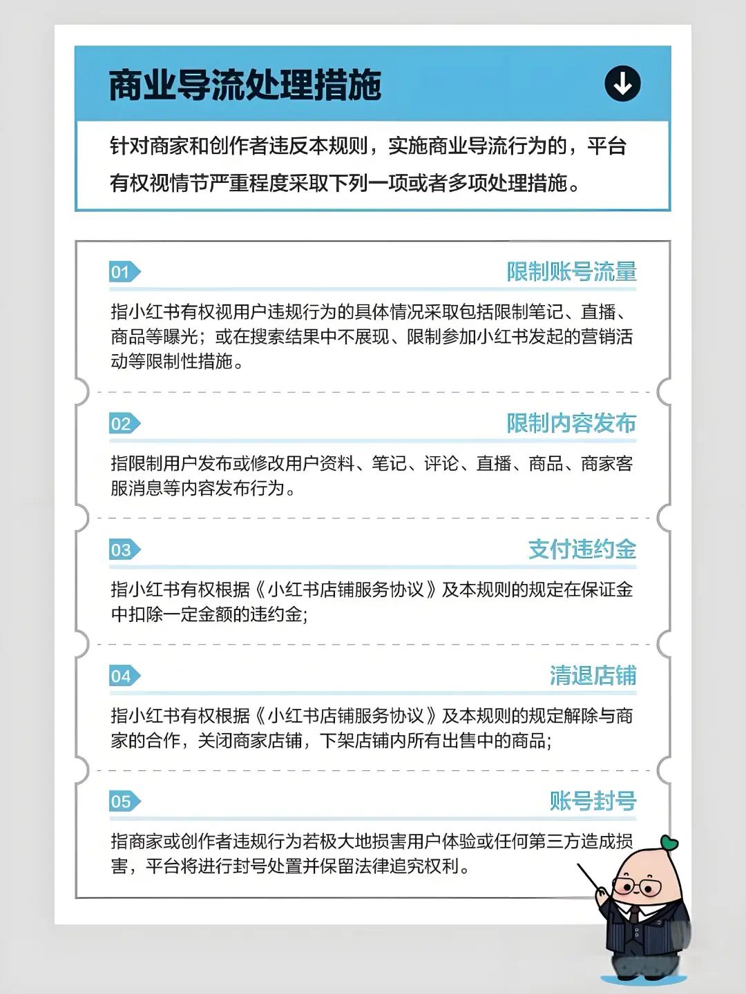 公告中称,对于提供微信号/电话或引导加微信/电话等联系方式至站外交易、发送其他平台的链接等至站外交易的行为,将被判定为违规。而平台对于违规导流的处罚更是毫不手软:根据情节严重程度采取限制账号流量、限制内容发布、支付违约金、清退店铺或账号封号等处理措施。
