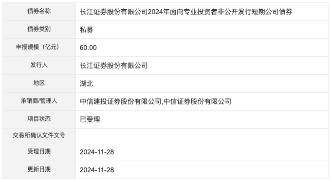 深交所项目进度信息显示,长江证券股份有限公司60亿元私募债项目状态更新为“已受理”,受理日期为2024年11月28日。