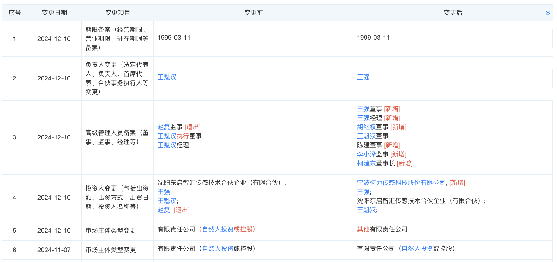 天眼查APP显示,近日,沈阳东大传感技术有限公司发生工商变更,原股东赵复退出,新增柯力传感为第一大股东,持股51%;同时,公司主要人员亦发生变更,其中柯建东成新任董事长,新增王强为公司经理、董事、法定代表人。天眼查显示,沈阳东大传感技术有限公司成立于1999年3月,法定代表人为王强,注册资本为200万元,主营高端温度传感器的定制化设计研发与测温技术服务。