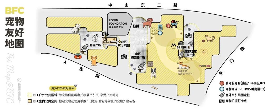 在一些强调“宠物友好”的购物中心,通常会专门规划出了特定的宠物活动区域,例如上海BFC外滩金融中心拥有30多家宠物友好餐厅和90多家宠物友好商店,BFC进行了宠物活动空间的划分,选择性地将一些店铺设定有宠物友好标识,并通过「宠物友好地图」的方式进行明确展示。同时,商场也设有「宠物友好须知」,清晰地告知了宠物进入商场后的标准规范,并且在室内时允许养宠人手抱宠物,不强制租借手推车。