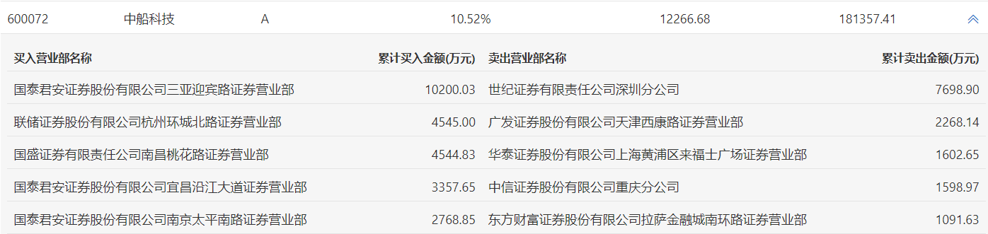 中船科技今日涨停,龙虎榜数据显示,上榜营业部席位全天成交3.97亿元,占当日总成交金额比例为21.88%。其中,买入金额为2.54亿元,卖出金额为1.43亿元,合计净买入1.12亿元。