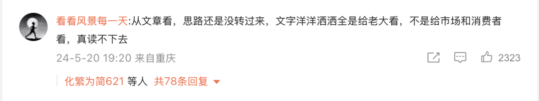 李瑞峰微博下的一条高赞评论说,“从文章看,思路还是没转过来,文字洋洋洒洒全是给老大看,不是给市场和消费者看,真读不下去。”