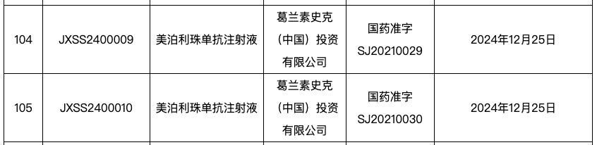 1月3日,根据国家药监局公布的药品批准证明文件送达信息,葛兰素史克(GSK)的美泊利珠单抗注射液在国内获批新适应症,批准日期为2024年12月25日。据了解,2024年年初,葛兰素史克新可来?(美泊利珠单抗注射液)在华获批用于成人和12岁及以上青少年重度嗜酸粒细胞性哮喘(SEA)的维持治疗。