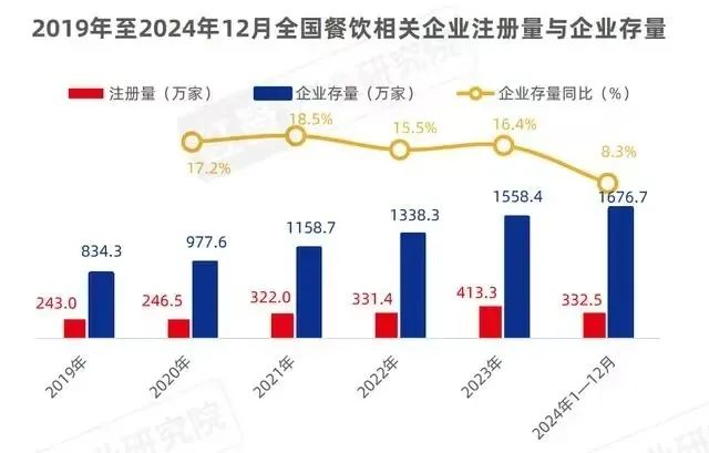 据最新数据显示,2024年度全国餐饮领域新增企业注册数量突破330万家,企业总量攀升至1676.7万家。
