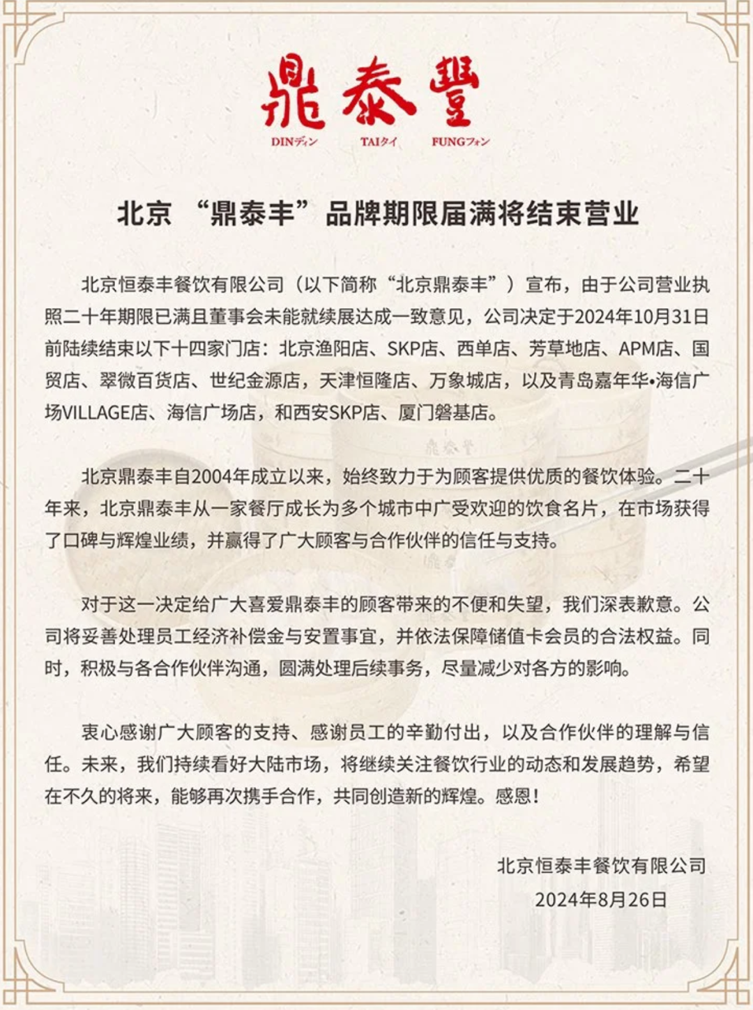 图 | 鼎泰丰陆续关闭位于北京、天津、西安等地的14家门市
