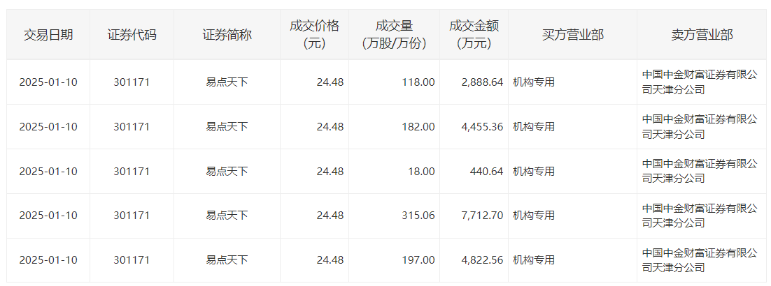 易点天下1月10日大宗交易成交830.06万股,成交额2.03亿元,占当日总成交额的19.61%,成交价24.48元,较市场收盘价26.41元折价7.31%。