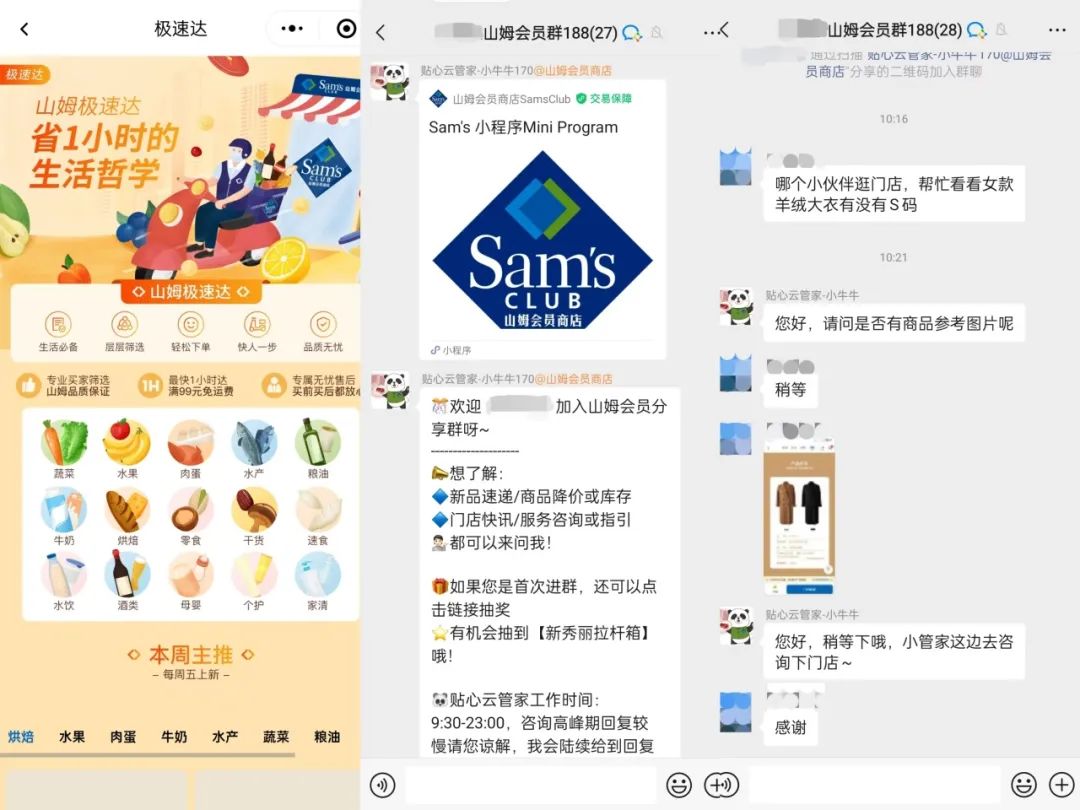 同时,用本地化思维完善数字化能力,通过小程序打通线上、线下,用企微提供服务。比如山姆的官方App提供「极速达」和「全城配」服务,成为会员后,可以加入相应区域的企业微信社群,获取一对一客服和日常咨询、产品讯息等服务。而他们也会通过与腾讯云的合作,从云基建层面提效,确保上层产品能力、数据的高效运转,进一步确保前端产品与服务的稳健。