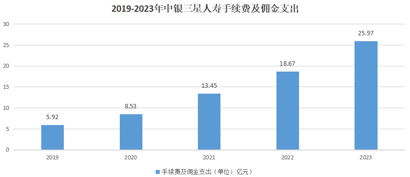 在手续费及佣金支出方面,2019-2023年,中银三星人寿已从不足6亿元增至近26亿元,五年间增长339%。