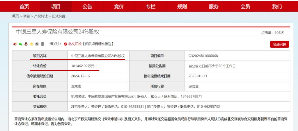 但近两个月,中银三星人寿股权突生变数。2024年10月底,北京产权交易所披露过中航集团拟转让中银三星人寿股权一事。时隔两个月,中航集团再次挂牌转让股权,显示其去意已决。