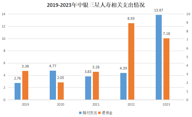 从具体支出来看,2022年、2023年中银三星人寿退保金分别为9亿元、7亿元;2023年赔付支出约14亿元,较2022年增长214%。