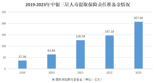 保险责任准备金提取这一项尤为引人注目。2021年到2023年,中银三星人寿该项支出分别约127亿元、147亿元、207亿元,同比分别增长99%、16%、41%,而且占各年营业支出比例均在75%以上。