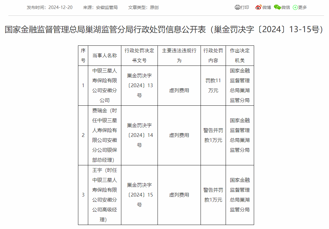 国家金管局官网2024年12月20日信息显示,因虚列费用,中银三星人寿安徽分公司及两名责任人被国家金管总局巢湖监管分局处罚。