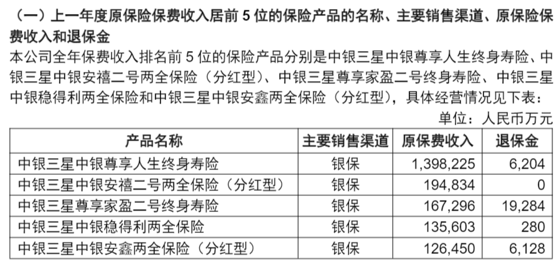 数据显示,公司原保险保费收入前五的产品均来自银保渠道。以2023年为例,银保渠道产品贡献超210亿元,占年度总保费80%以上。