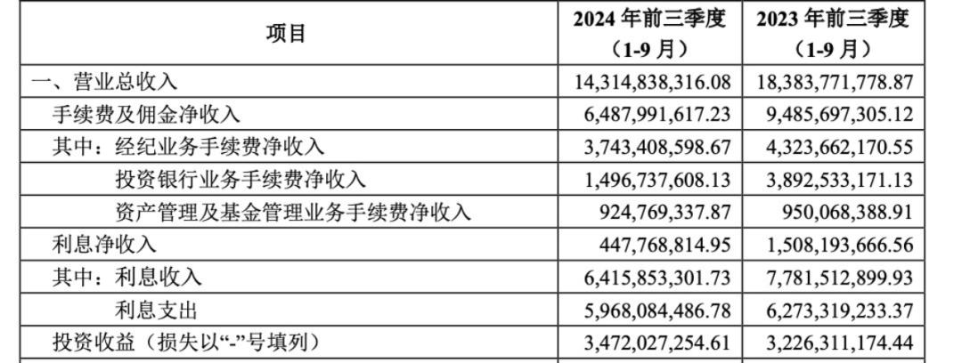 2024年前三季度,经纪业务手续费收入37.43亿元,同比下滑13%;资产管理与基金业务手续费收入9.25亿元,同比微降2%。