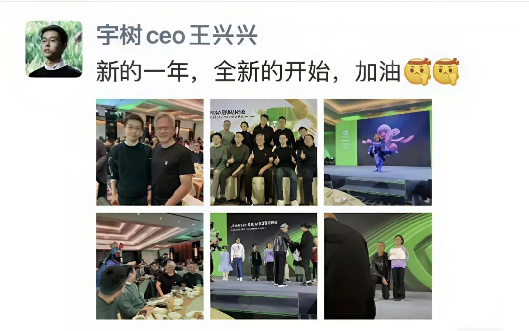 名场面则是现场聚集了一群眼下最火的90后明星创业者。宇树科技CEO王兴兴在个人社交平台晒与黄仁勋合影,并表示:“新的一年,全新开始,加油”;银河通用创始人兼CTO王鹤,也在晚宴中坐在黄仁勋身边。