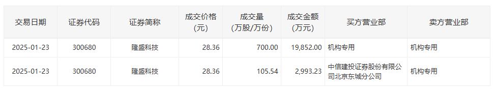 隆盛科技1月23日大宗交易成交805.54万股,成交额2.28亿元,占当日总成交额的17.45%,成交价28.36元,较市场收盘价29.24元折价3.01%。