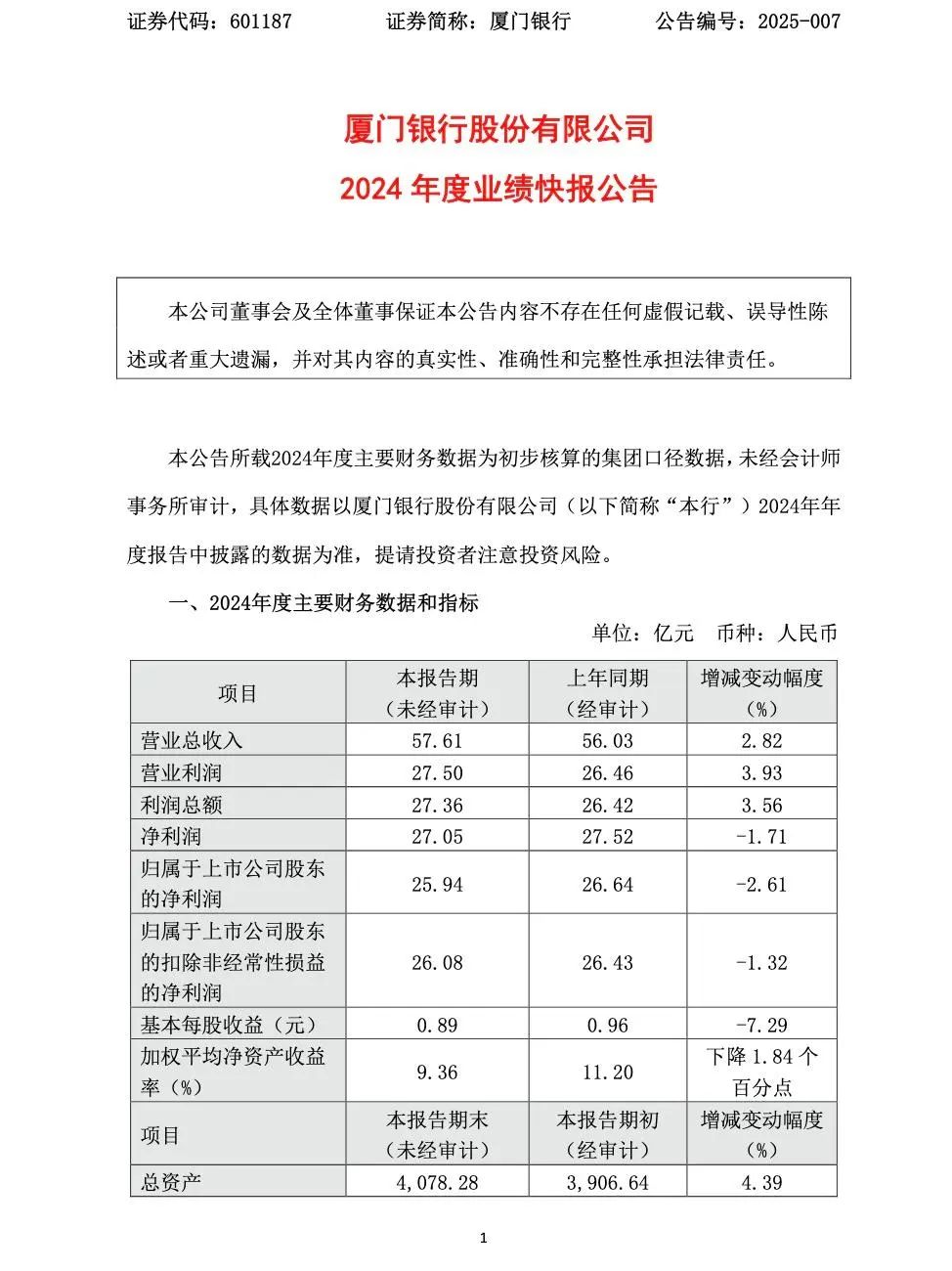 根据2024年度业绩快报显示,厦门银行实现营业收入57.61亿元,同比增长2.82%;归属于上市公司股东的净利润25.94亿元,同比下降2.61%。