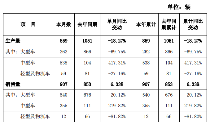 中通客车2月5日公告,2025年1月产量859辆,同比下降18.27%;1月销量907辆,同比增长6.33%。