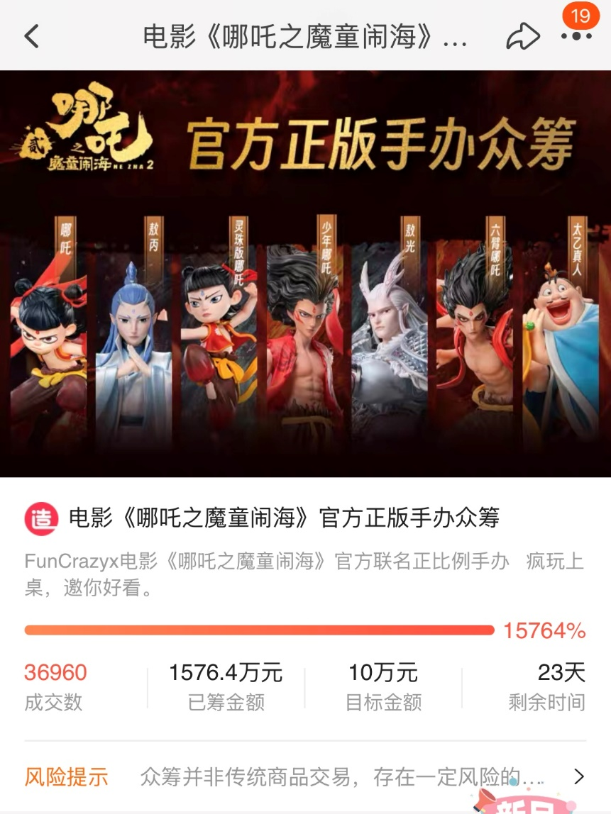 众筹类周边手办也迎来了大爆发,Fun Crazy与《哪吒2》官方联名推出了正比例手办,仅推出一周时间就15764%的完成了众筹进度。截至发稿前,定价从198元到1938元不等的手办套装已成交36960套,原始目标金额10万元,而现在已筹金额已经达到了1576.4万元,火爆程度可见一斑。