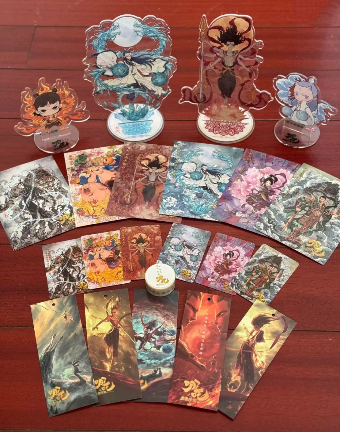 泡泡玛特推出搪胶毛绒玩偶、盲盒手办;卡游推出收藏卡礼盒、马口铁徽章、电影典藏卡;集卡社、森罗万象推出典藏版收藏卡、捏捏乐、镭射票、亚克力扭蛋机;灵动创想推出搪胶大娃、普奇努努玩偶、芽豆豆玩偶;中信出版集团推出官方限定集和官方番外绘本;Fun Crazy推出色纸、台词系列徽章、亚克力挂件、徽章夹、毛绒挂件盲盒、透卡……