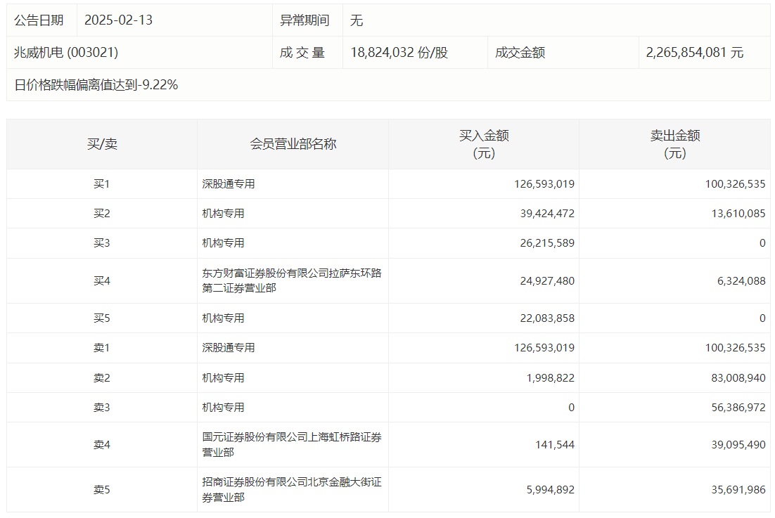 2月13日,兆威机电高位跌停,深股通卖出1亿元并买入1.27亿元,两机构卖出1.39亿元,三机构买入8772万元。