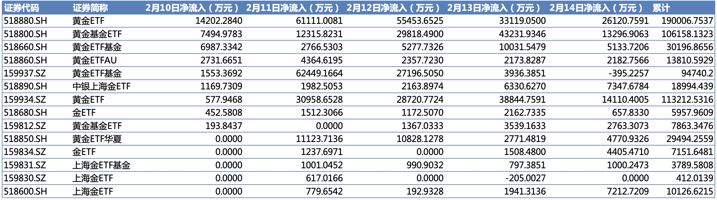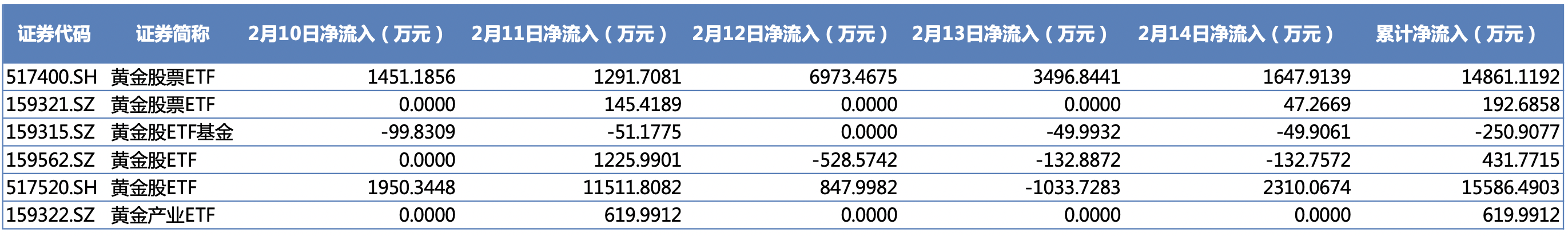 具体来看,国泰中证沪深港黄金产业股票ETF(517400.SH)和永赢中证沪深港黄金产业股票黄金股ETF(517520.SH)是资金流入最多的两个产品,累计净流入分别为1.49亿元和1.56亿元。