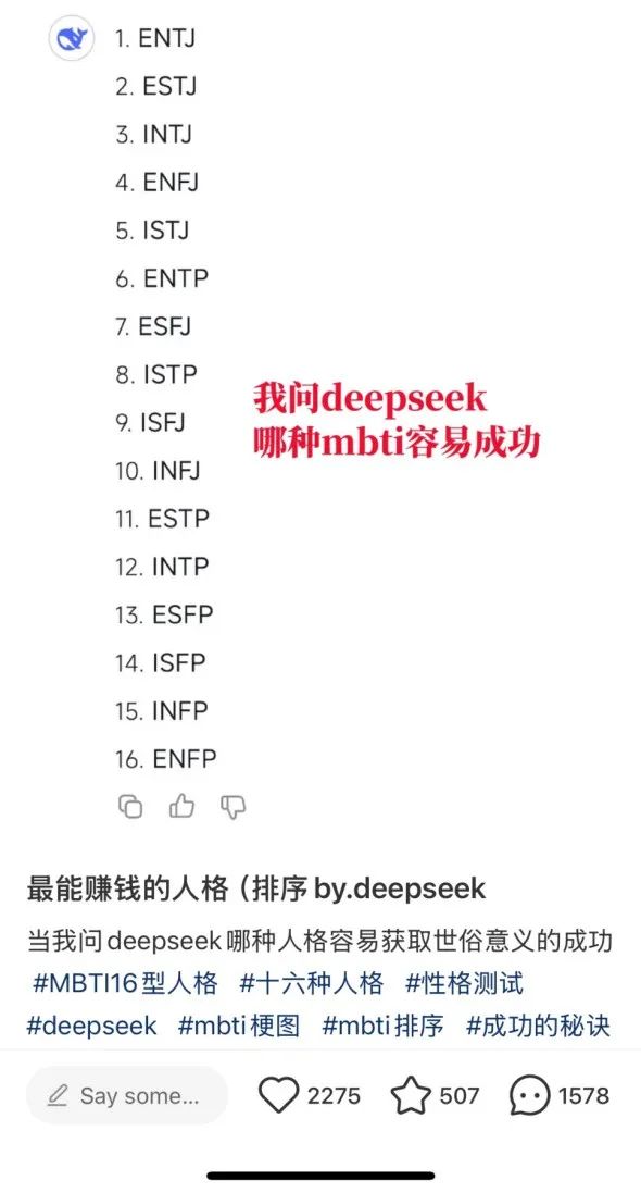 创号二十四小时内,她发布了一篇笔记,主题为“用DP给MBTI人格的赚钱能力排序”。不到一天,浏览量破二十万。对于一个0基础新号,这样的成绩是极难达成的。