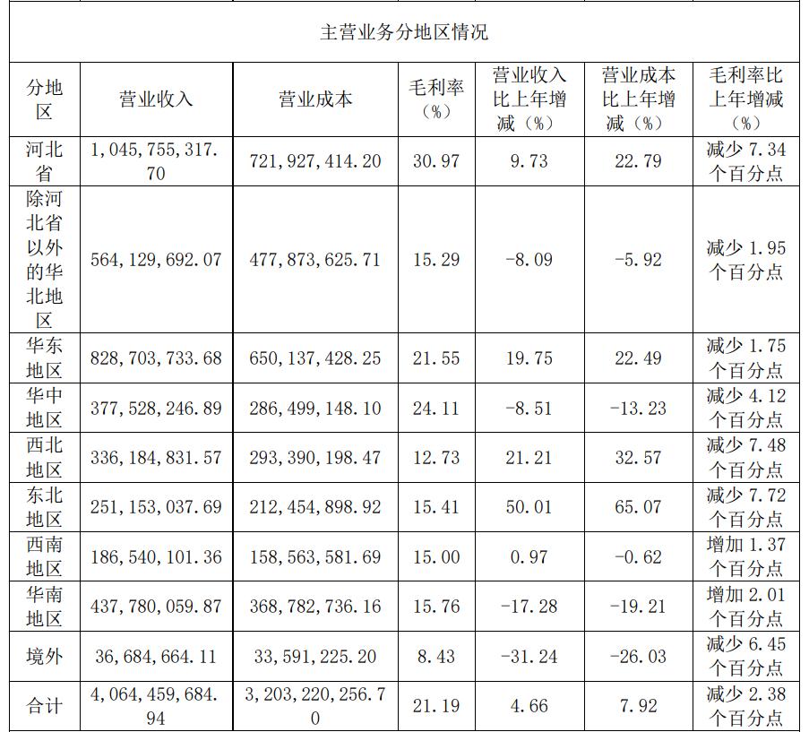 分地区来看,科林电气在河北省、华东地区、西北地区、东北地区营业收入较上年同期分别增长9.73%、19.75%、21.21%、50.01%,增幅较快;在华南地区、境外市场营业收入较上年同期分别下降17.28%、31.24%,跌幅明显。