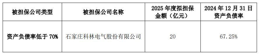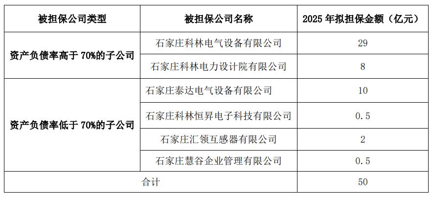 公告显示,鉴于公司全资子公司和控股子公司业务规模持续扩张,为满足公司合并报表范围内子公司业务发展资金需求,公司拟为合并报表范围内部分子公司(具体包括:石家庄科林电气设备有限公司、石家庄科林电力设计院有限公司、石家庄泰达电气设备有限公司、石家庄恒昇电子科技有限公司、石家庄慧谷企业管理有限公司、石家庄汇领互感器有限公司)提供担保额度合计不超过50亿元(担保额度为敞口概念)。