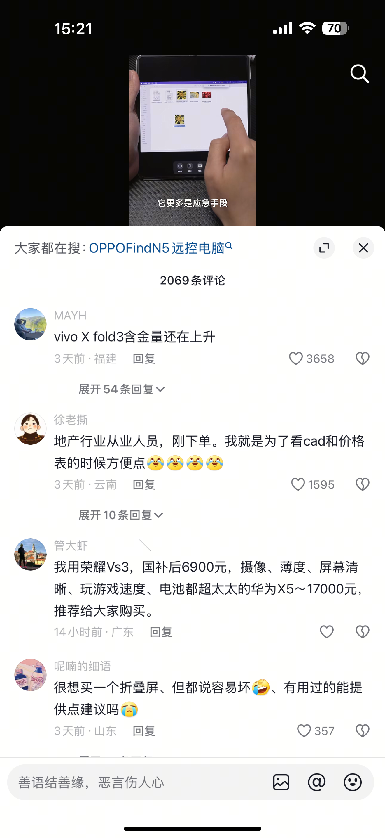 但在一条Find N5的评测视频里,博主演示完一系列牛马功能之后,没忍住说了句大实话——更多的是应急手段。在这条视频下面,排名靠前的三条评论里出现了两款竞品,涉及OPPO的一条夸赞还是所有折叠屏都具备的优点。